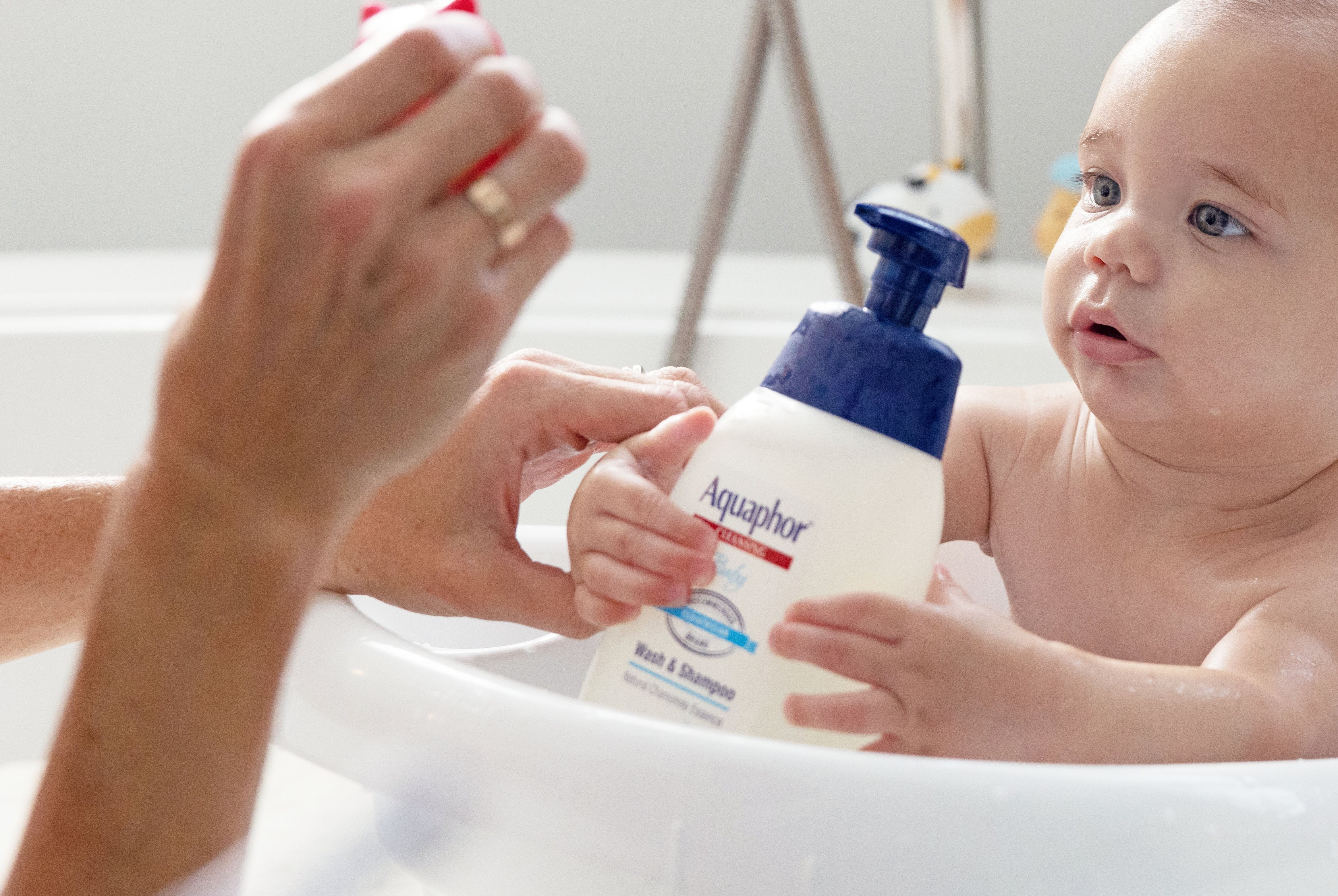 Wipes can leave a residue that can further irritate the skin. Instead of wiping and rubbing your baby’s diaper area clean, give their bottom a quick soak in warm water mixed with a gentle, fragrance-free wash like Aquaphor Baby Wash & Shampoo.
